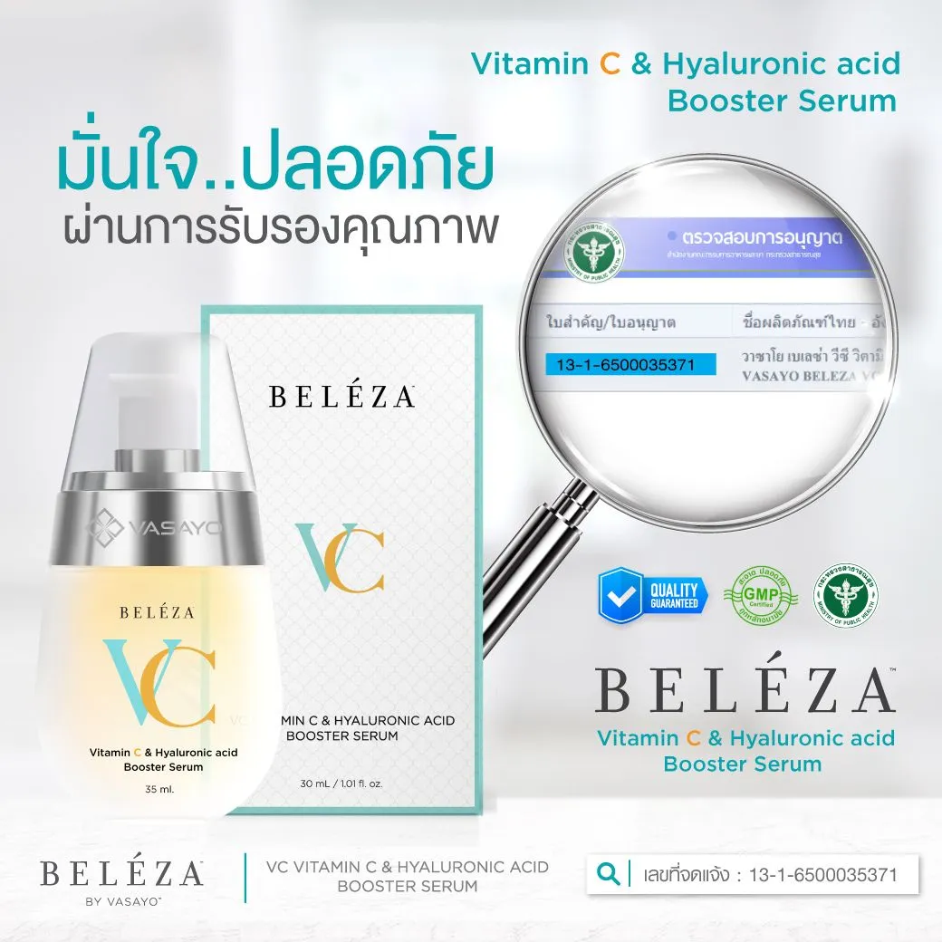 Beleza VC Vitamin C & Hyaluronic Acid Booster Serum VONCE บูสเตอร์ เซรั่มบำรุงผิวหน้า ที่อุดมไปด้วยวิตามินซี มีคุณสมบัติในด้านการบำรุงผิวหน้าให้ขาวสว่าง กระจ่างใส ซึมสู่ผิวเพื่อเข้าไปกระตุ้นการทำงานของเซลล์ผิวหน้าให้ดีขึ้น เติมร่องลึกให้ดูอิ่มฟู และทำงานได้อย่างปกติคงไว้เพียงใบหน้าที่แลดูกระจ่างใส และสุขภาพดี