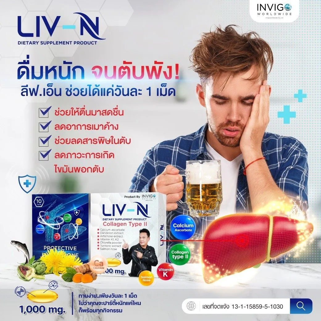 สำหรับคนที่ชอบดื่มเครื่องดื่มแอกลอฮอล์ LIV-N ลีฟ เอ็น ช่วยให้ตื่นมาสดชื่น ลดอาการเมาค้าง ช่วยลดสารพิษในตับ ลดภาวะการเกิดไขมันพอกตับ